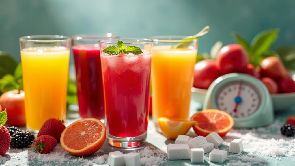 Many people underestimate the sugar content in fruit juices, which can considerably impact your daily sugar intake. A 6-ounce serving of 100% fruit juice packs around 15-30 grams of sugar, elevating your caloric content by 60-120 calories per serving. While these numbers might seem small, they accumulate quickly, especially if you're drinking multiple servings throughout the day. Unlike whole fruits, fruit juices lack dietary fiber, leading to rapid sugar absorption and potential spikes in blood glucose levels.