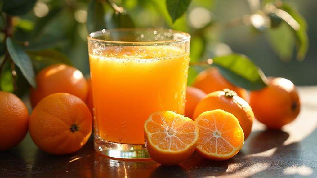 Kumquat juice is your go-to for a citrus vitamin C punch that energizes your immune health. Packed with 44 mg of vitamin C per 100 grams, it covers 73% of your daily intake. Its antioxidants support by neutralizing free radicals, while the fiber keeps your digestion smooth and your microbiome healthy. Kumquat juice isn't just low in calories; it's also a source of hydration and vital minerals like calcium and potassium. To enjoy this nutrient enhancement, simply blend and strain fresh kumquats for a rejuvenating drink. There's so much more to uncover about this citrus wonder.