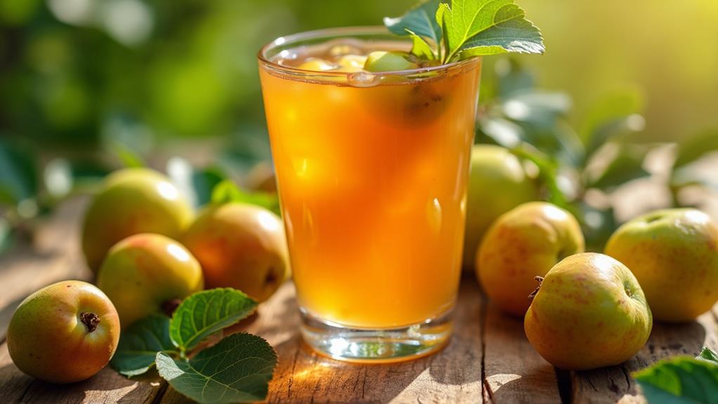 If you're looking to elevate your immune health, medlar juice might be just what you need. This unique juice is made from medlar fruit and features a delightful sweet-tart flavor, similar to apple sauce. It's packed with antioxidants and anti-inflammatory properties, which help combat oxidative stress and improve immune function. Plus, the high vitamin C content supports white blood cell production for a stronger immune system. Enjoy it on its own or add a twist to cocktails and desserts. You might be surprised at how this flavorful juice can enrich your wellness expedition. Uncover more about its many benefits.