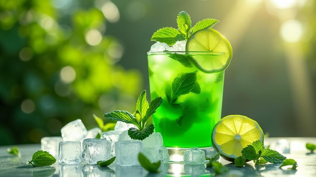 Mint juice is perfect for revitalizing your senses and supporting your digestive health. It's rich in antioxidants, vitamins, and minerals, and mint can help alleviate bloating and digestive discomfort. The cooling effect of mint makes this drink a summer favorite. To prepare, blend fresh mint leaves with water, strain, and add lemon juice, jeera, pepper, and your choice of sweetener. Improve it with flavors like honey, fruits, or yogurt for a twist. Experiment with variations like watermelon or cucumber for added hydration. Enjoy this delicious drink chilled, and uncover exciting ways to customize and savor mint juice further.