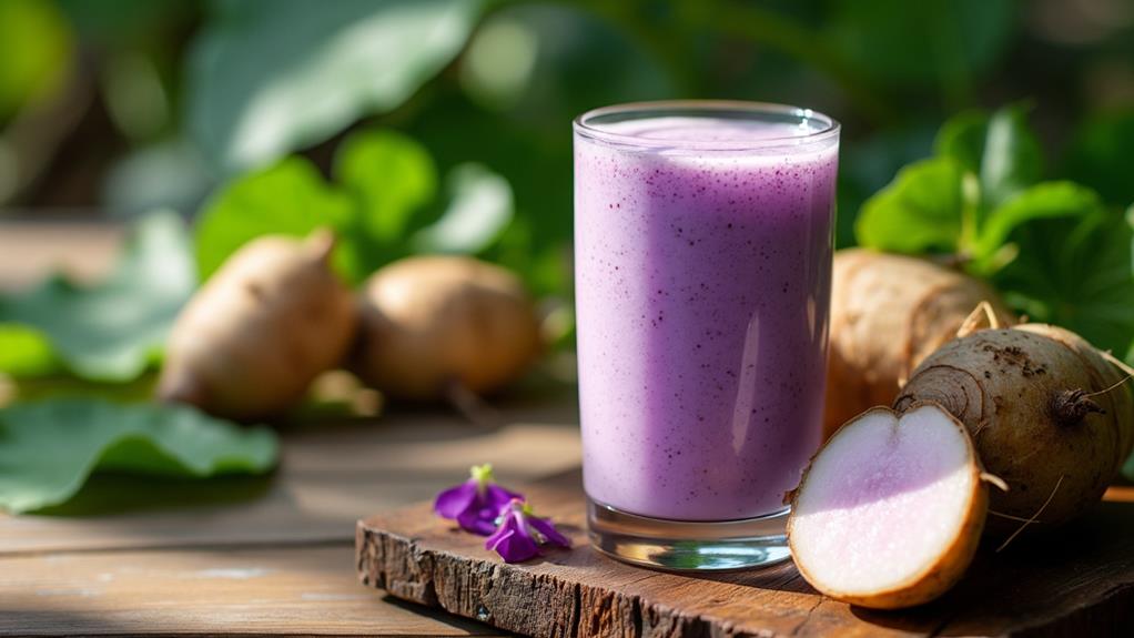 Moreover, resistant starch in taro bolsters your metabolic health, making it a valuable enhancement to a balanced diet. As you enjoy taro root juice, you're not just getting an energy lift; you're also benefiting from its unique nutritional properties. So, savor this sweet and starchy drink while supporting your health in multiple ways.