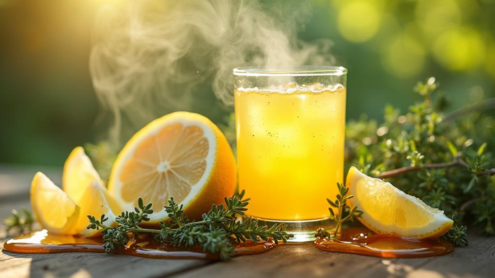 You can improve your respiratory health and fight off pathogens with thyme juice. It acts as a natural expectorant, easing congestion and soothing your throat. With key antimicrobial components like thymol and carvacrol, it combats bacteria and fungi, helping prevent infections and promoting a balanced gut microbiome. Rich in vitamin C, thyme juice boosts your immune function and reduces airway inflammation, which is especially beneficial if you have bronchitis or asthma. It's also a flavorful supplement to your meals, offering a nutrient-dense way to improve wellness. There's more to uncover about its diverse health benefits.