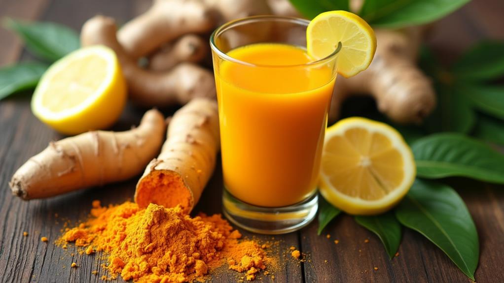 Turmeric root juice is a golden powerhouse for your joint health, thanks to its high curcumin content. It helps ease inflammation linked to arthritis and joint pain by blocking inflammatory pathways and reducing the production of pro-inflammatory cytokines. Regular intake can improve your joint function and mobility while alleviating symptoms like stiffness. Pairing turmeric juice with black pepper amplifies curcumin absorption, enhancing its benefits. However, it's crucial to be careful if you're on medication, as turmeric can interact with certain drugs. Exploring further could reveal strategies to optimize its potential and avoid pitfalls.