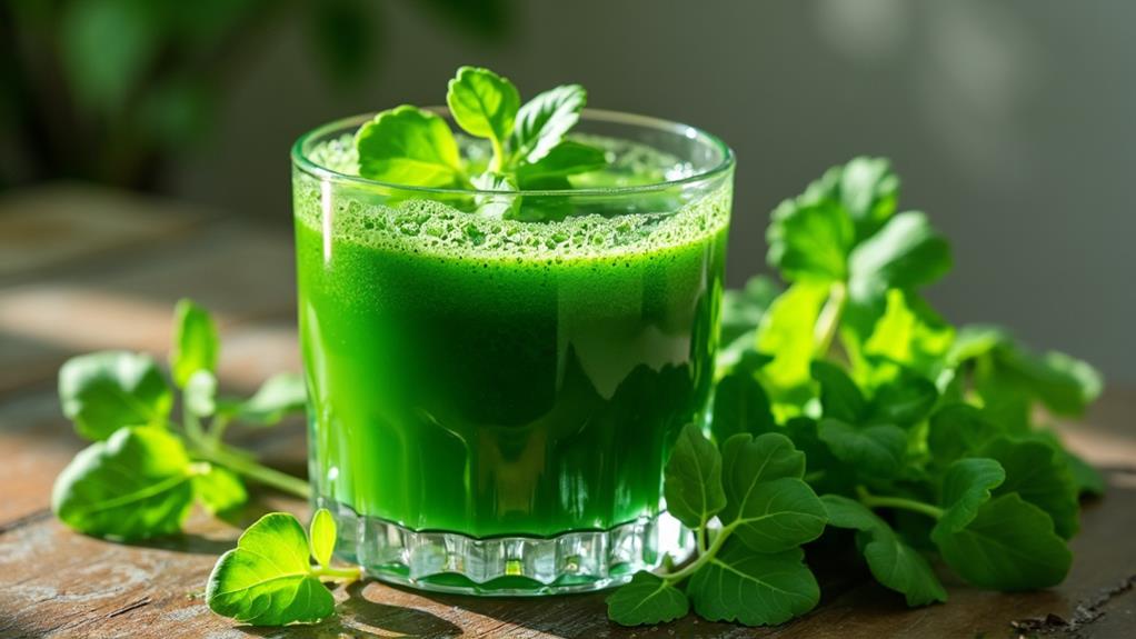 Watercress juice also supports cardiovascular health due to its content of dietary nitrates, which improve blood flow and vascular health. This can help maintain comprehensive heart health. Remember, it's essential to wash the watercress thoroughly before juicing to remove any potential contaminants. By understanding watercress juice's potent benefits, you can make a healthful enhancement to your diet that supports your immune system and comprehensive well-being.