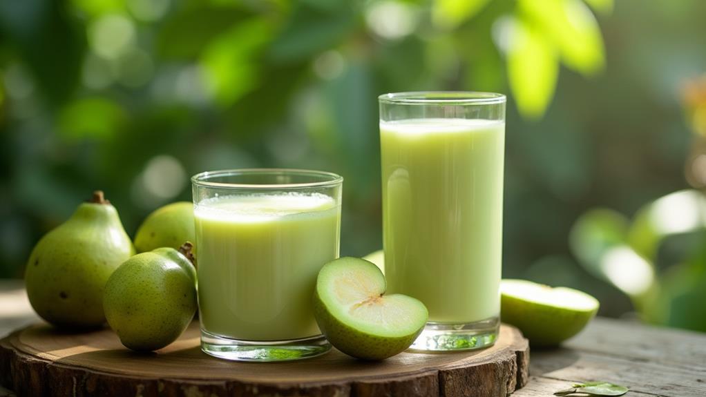 You can't resist the creamy and sweet allure of white sapote juice. It's packed with potassium, making it fantastic for maintaining healthy blood pressure and muscle function. This juice boasts a delightful blend of sweet apple and banana flavors, enriched with vitamins A and C. Ideal for smoothies or as a cocktail base, it's a natural treat that supports heart health and keeps your energy levels up. The fruit, native to Central America, is a wealth of nutritional benefits, enhancing flavor and vitality in every sip. Uncover more about its enticing attributes and versatile uses.